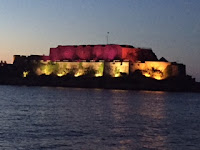 Um etwa 13:45 Uhr überfahren wir die französisch/britische Grenze. Guernsey ist mit seiner felsigen Steilküste in Sicht. Weiter an Steuerbord sehen wir die Inseln Sark und Jersey. Vor der Steilküste gehen wir auf Ostkurs um die Südöstliche Spitze der Insel. Bald kommt der Hafen Saint Peter-Port in Sicht. Nachdem alle Segel unten und ordentlich verstaut sind, saust der Anker auf den Grund. In den Hafen einlaufen können wir mit unseren 2,90 Meter Tiefgang nicht. Der Hafen unterliegt einem Gezeitenhub von etwa 9 Metern und fällt bei Ebbe trocken.