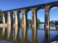 Zuerst überqueren wir die Mayenne auf der Pont de l’Europe und gehen dann auf dem linken Flussufer in Richtung Viadukt. Vorbei geht es an einer kleinen, von Hand zu bedienenden Schleuse und dann weiter auf dem Leinpfad… Ach neee, hier heißt das ja Chemin de halage 😉