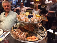 Es gibt „Plateau fruits de mer“, also eine Meeresfrüchteplatte. So mampfen wir dann fröhlich Tourteaux, Langoustines, Huîtres, Bulot, Bigorneaux, Amandes de mer, Crevettes und etwas Brot. Unbedingt dazu gehören eine Vinaigrette für die Austern und eine Knoblauchmayonaise für den Rest. Dazu genehmigen wir uns ein Flasche kühlen Muscadet. Das ist ein trockener Weißwein, der hervorragend zu Fisch und Meeresfrüchten passt.